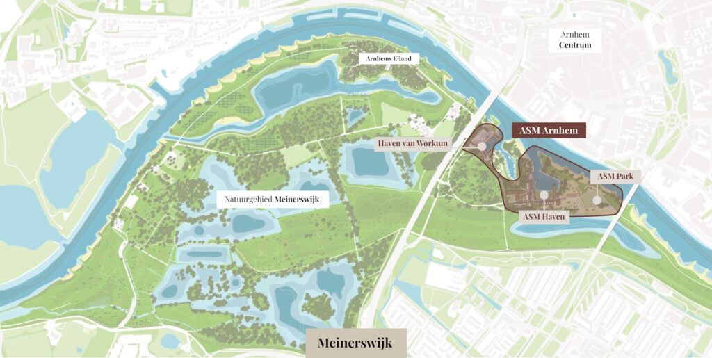 ASM Arnhem bestaat uit de Haven van Workum, de ASM Haven en het ASM Park. Er komen ongeveer 350 woningen, werkplekken en horeca. Maar ook plekken om te sporten, te recreëren, kunst te kijken en te feesten. Het wordt een bruisende, veelzijdige en verrassende wijk waar stad en natuur elkaar ontmoeten en twee stadsdelen met elkaar worden verbonden. ASM Arnhem staat voor industrieel, rauw en levendig.